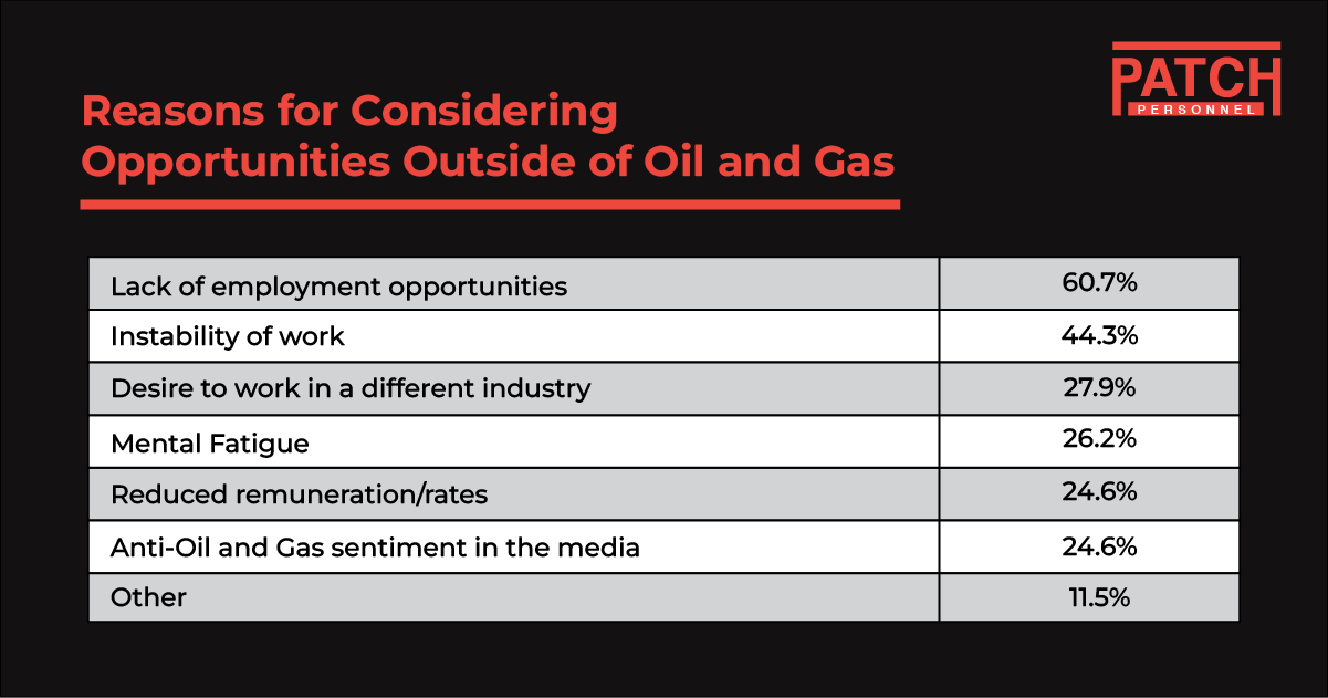 The report showed that more than half of survey participants (58.7%) have contemplated leaving the Oil and Gas industry in the past 12 months. While this may come as a surprise to some, perhaps it shouldn’t if we consider the number of market downturns since the oil price collapse in late 2014.
