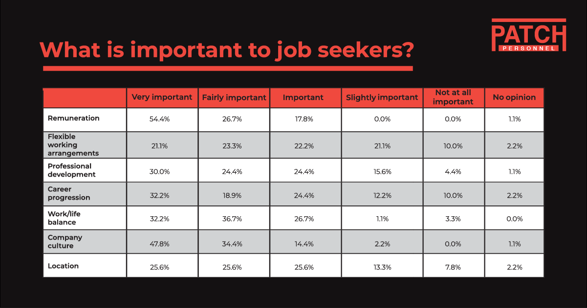 Overall, we didn’t see significant salary increases over the past 12 months although there were some areas such as Environment that did see growth. However, remuneration is not the only factor professionals will consider as they look for new jobs as highlighted in the table below.